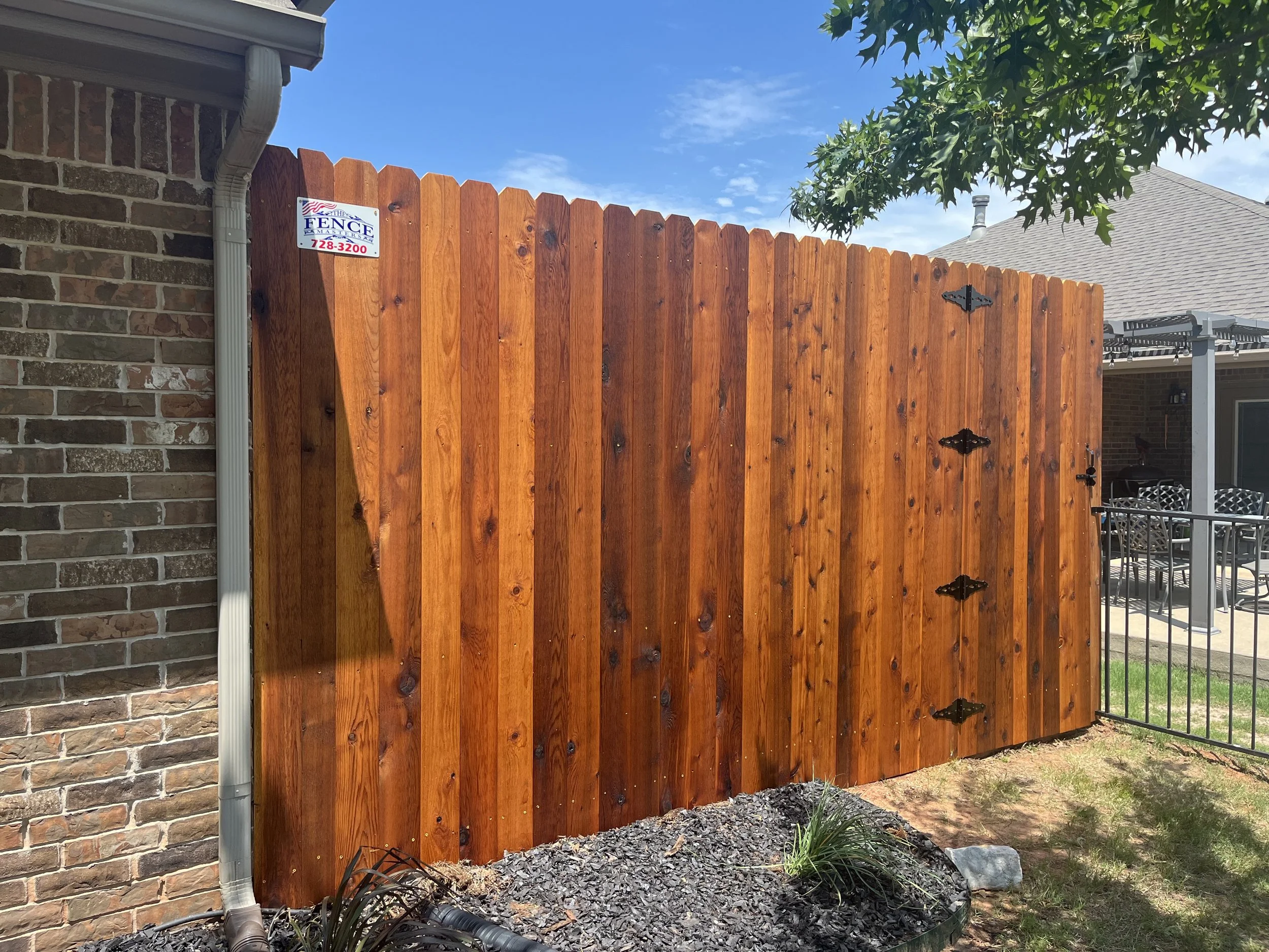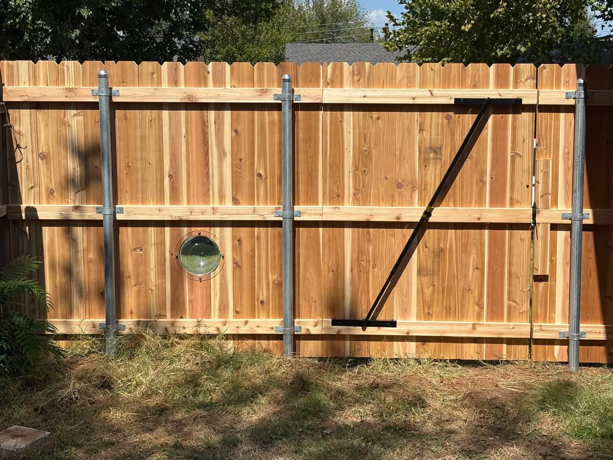 Our cedar is kiln dried Western Canadian Red Cedar in 7/8 inch thickness that takes stain well and holds up in Oklahoma wind. Our iron is powder coated with clean welds and hardware that lasts. Gates are framed not to sag and tuned to close clean before we leave. Most homes finish in about three days, yard left tidy, quote and timeline kept cle